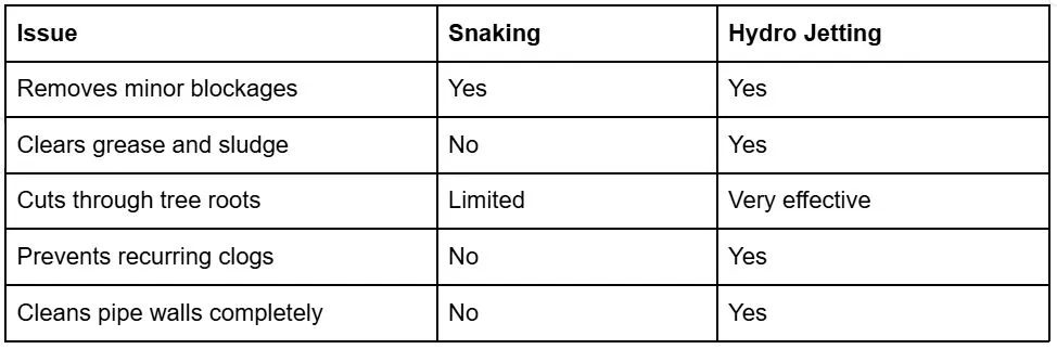 Snaking is great for quick fixes. Hydro jetting is ideal for long-term results.